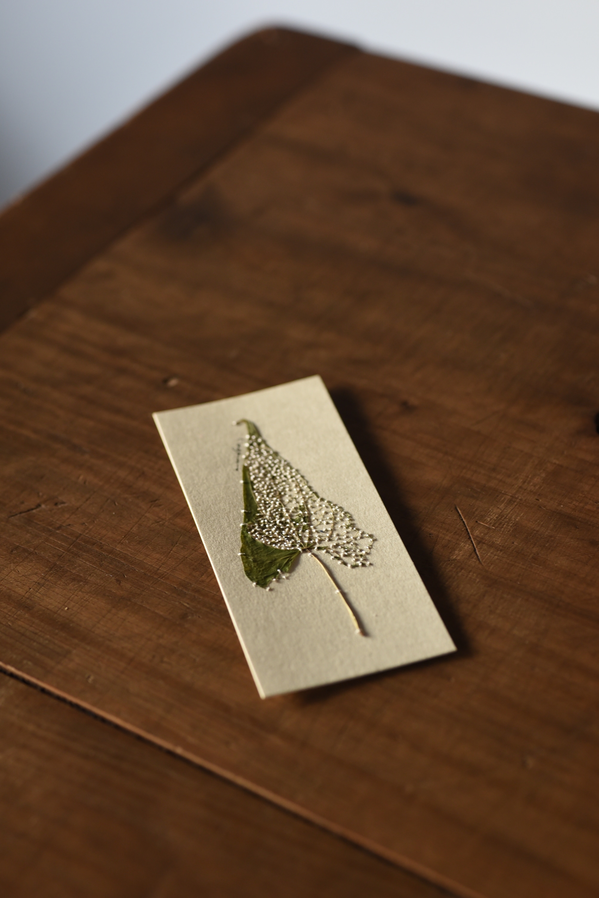 絹糸を使い台紙も染め、縫い留めていきます
