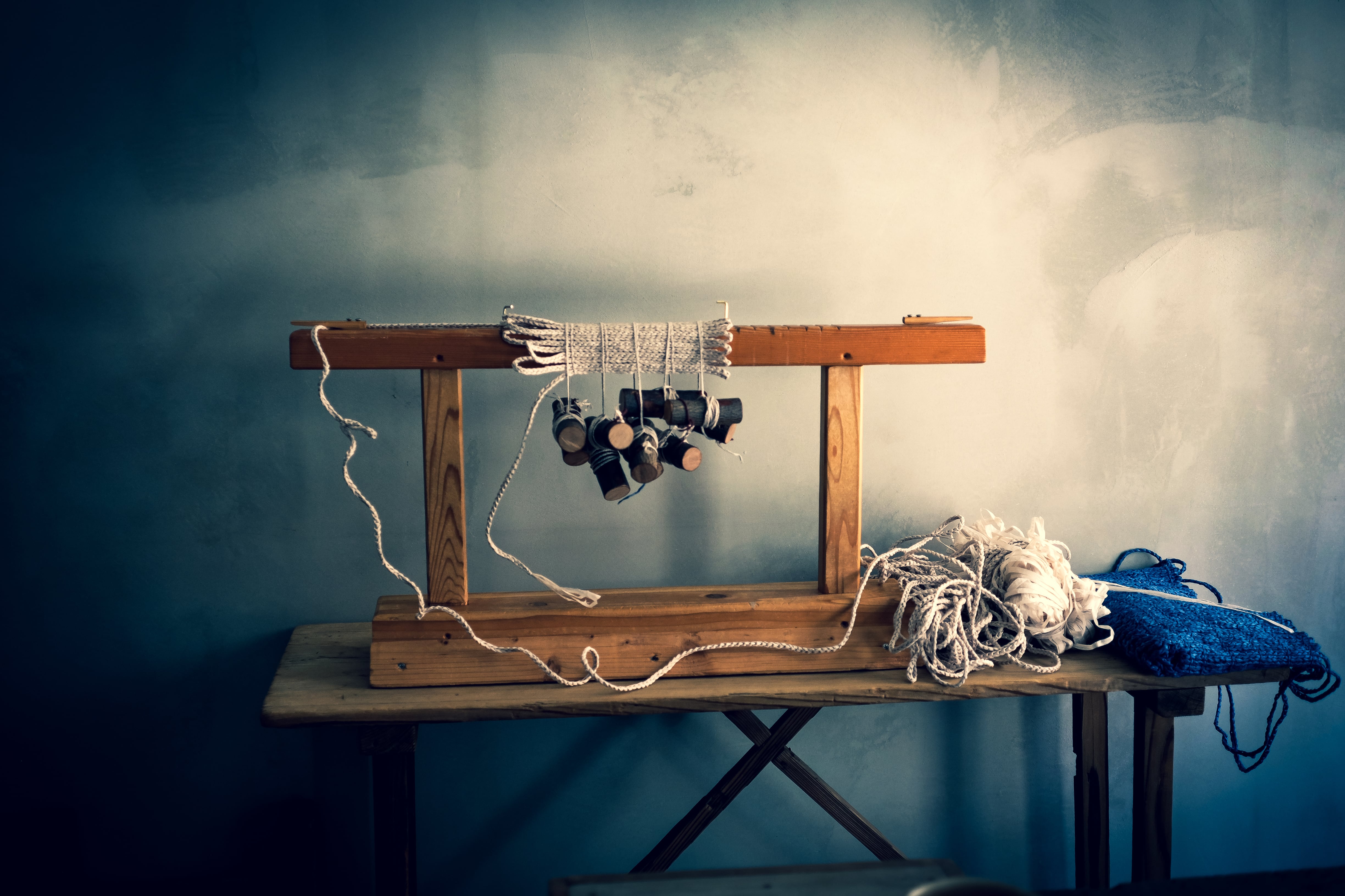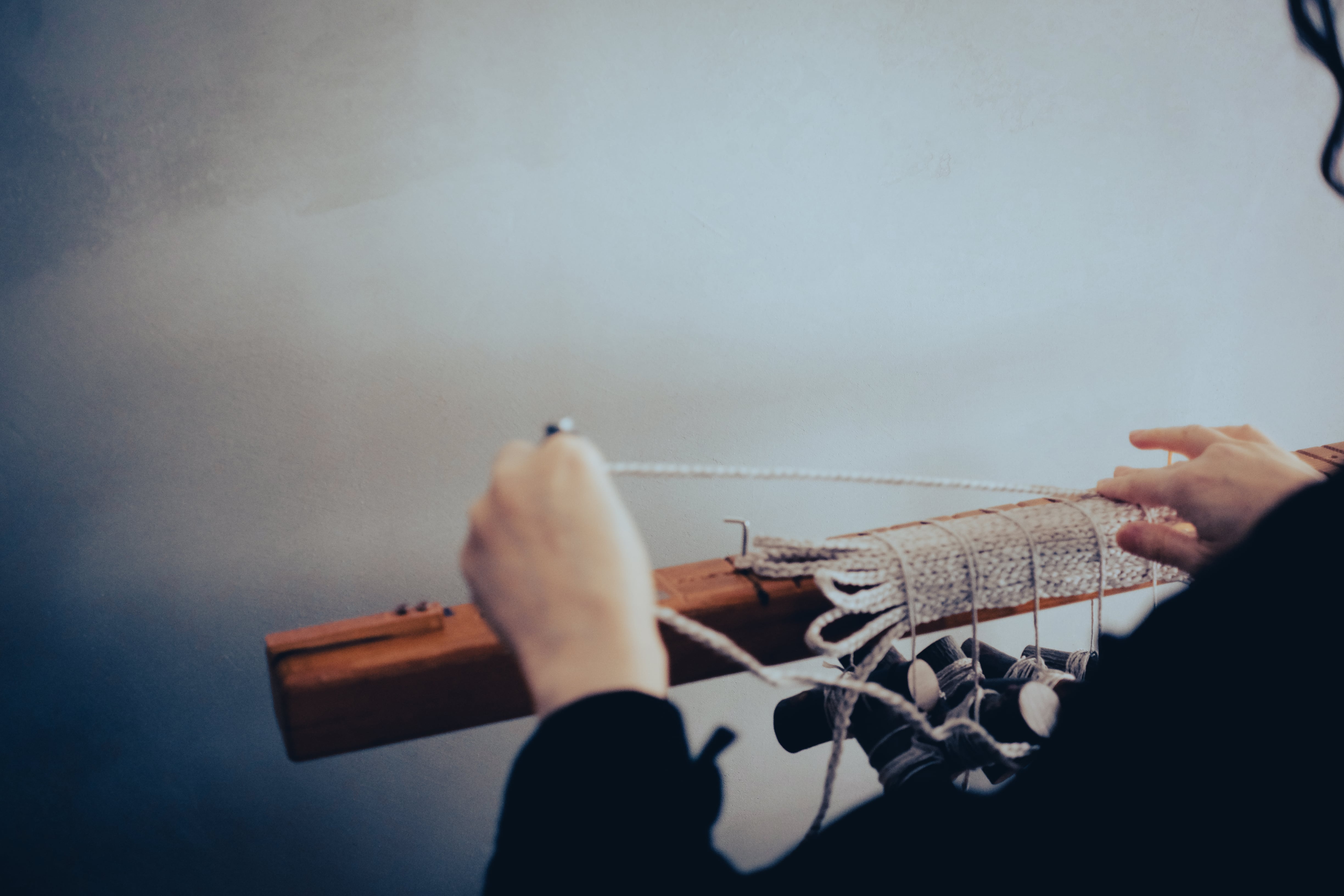 この作業でしっかりと強い糸になり、繊細な陰影が現れます。そしてここから、祖父、親から受け継いだ島の素材で作られた編み器で制作していきます。糸が巻きつけてある木がぶつかり合う音が、昔から全く変わらない暮らしを彷彿とさせます。