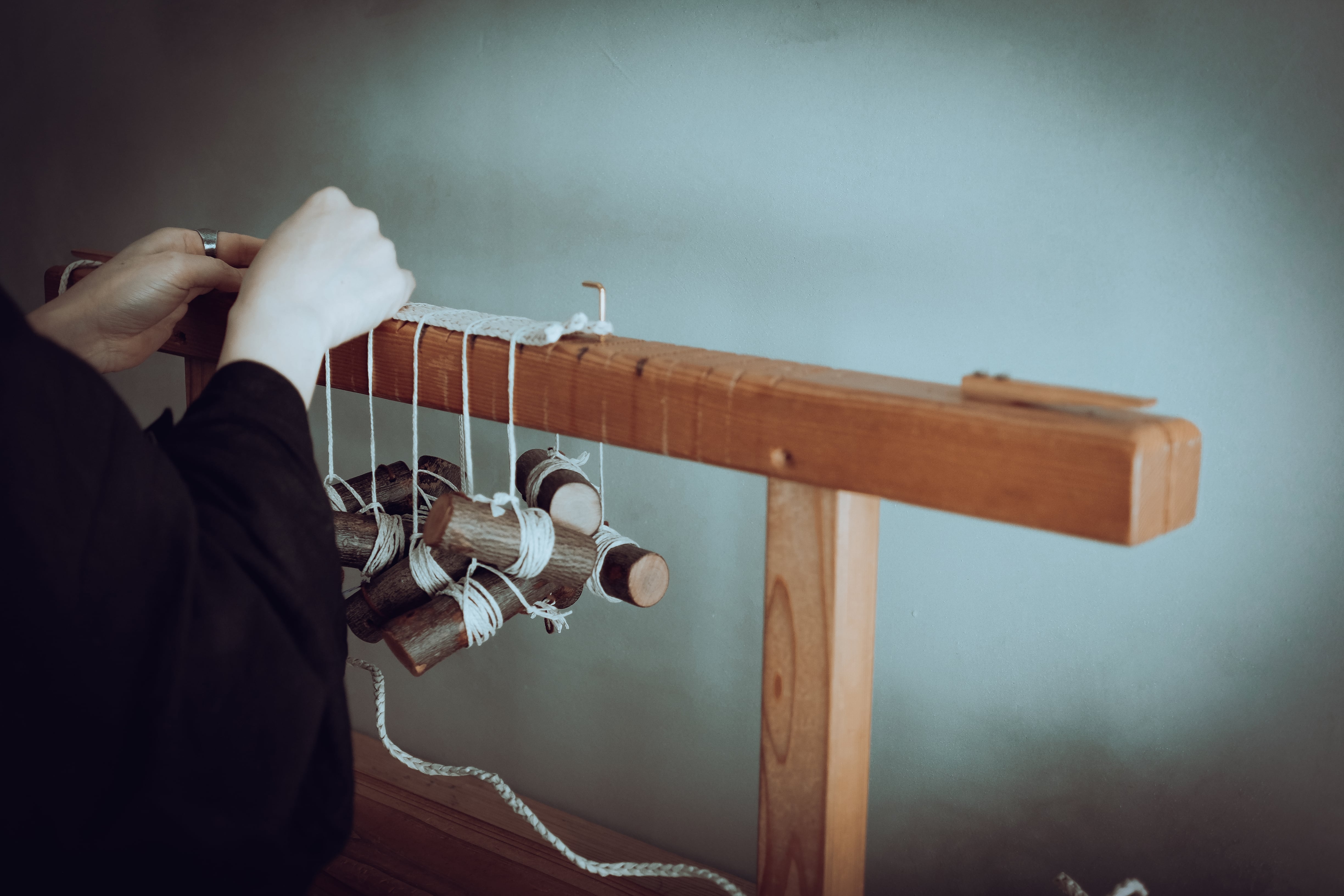 この作業でしっかりと強い糸になり、繊細な陰影が現れます。そしてここから、祖父、親から受け継いだ島の素材で作られた編み器で制作していきます。糸が巻きつけてある木がぶつかり合う音が、昔から全く変わらない暮らしを彷彿とさせます。