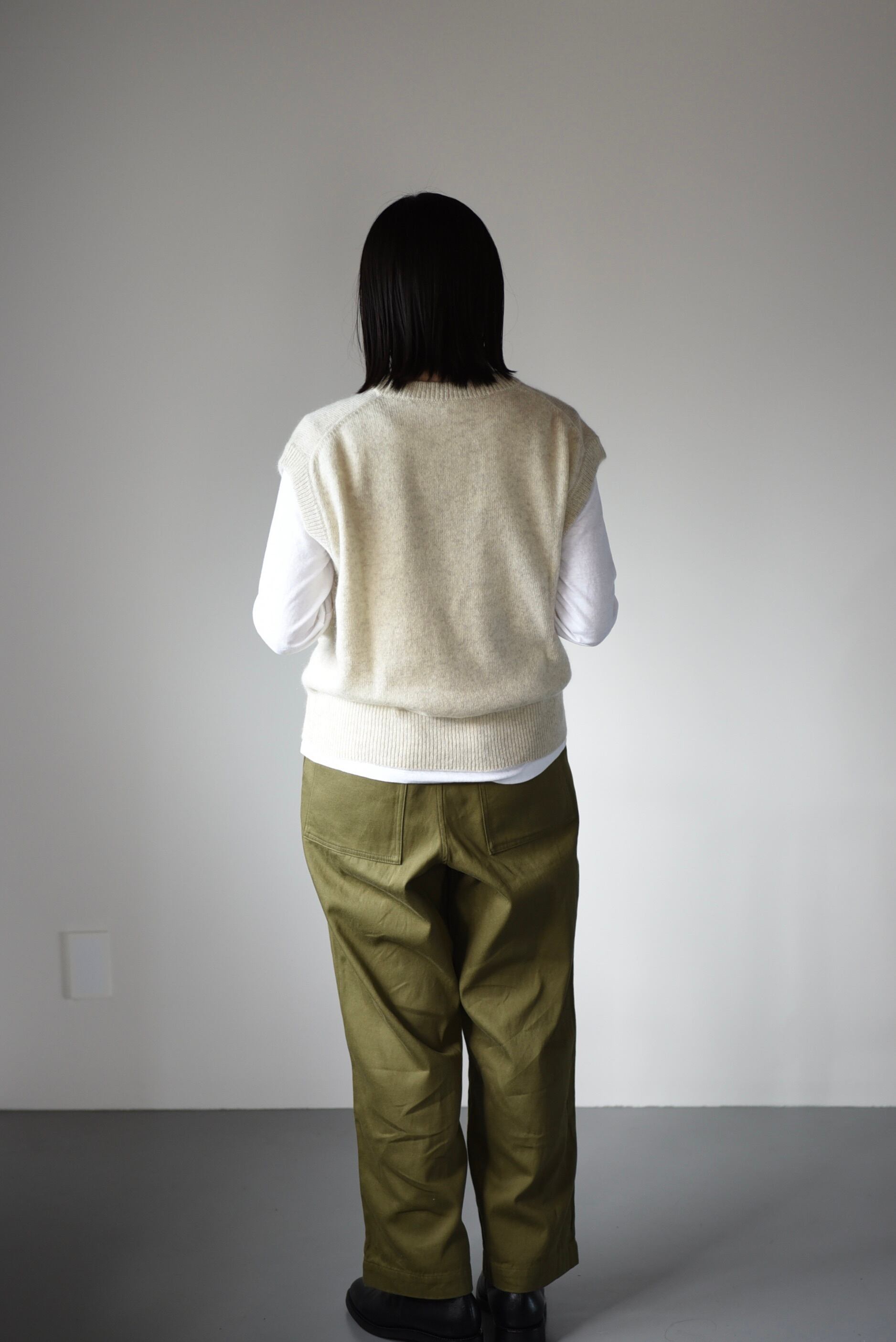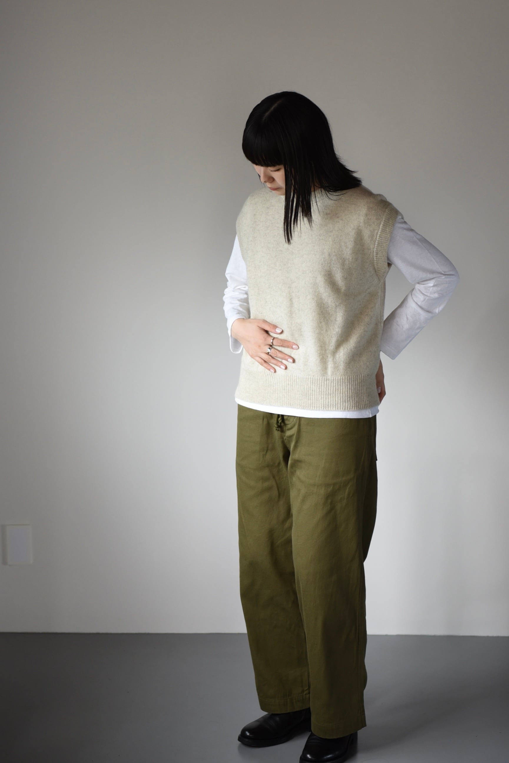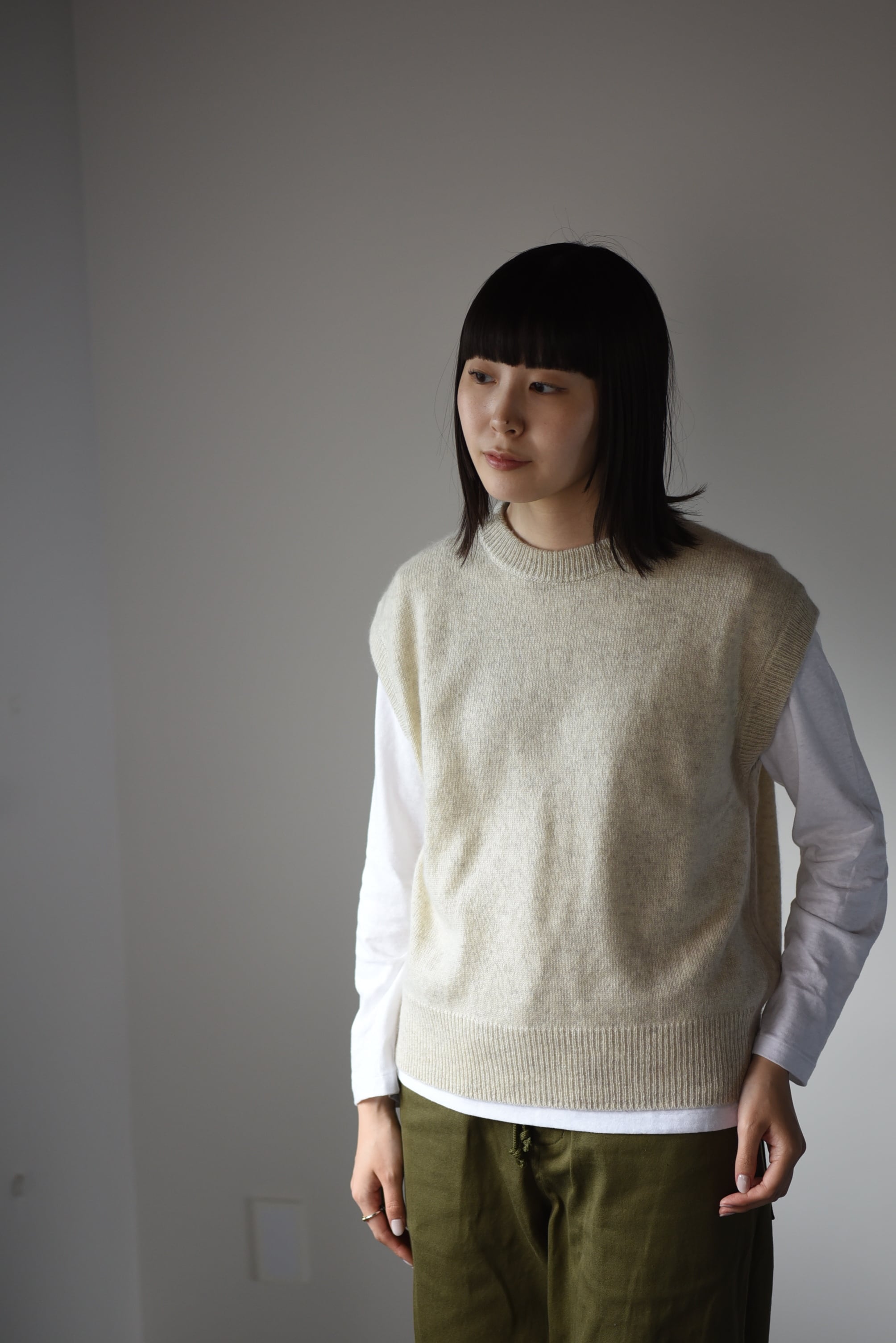 2025年のヤクのベストはこれまでより細い番手の糸で細かく編まれていて、柔らかでちょっと繊細な印象です。そしてドロップショルダー。二の腕を隠すように肩より少し落ちるデザインです。長袖Tシャツと重ねたり、ブラウスと重ねたり、パンツスタイルに合わせてもほんのりと女性らしさがプラスされて、いいバランスでスタイルが決まります。