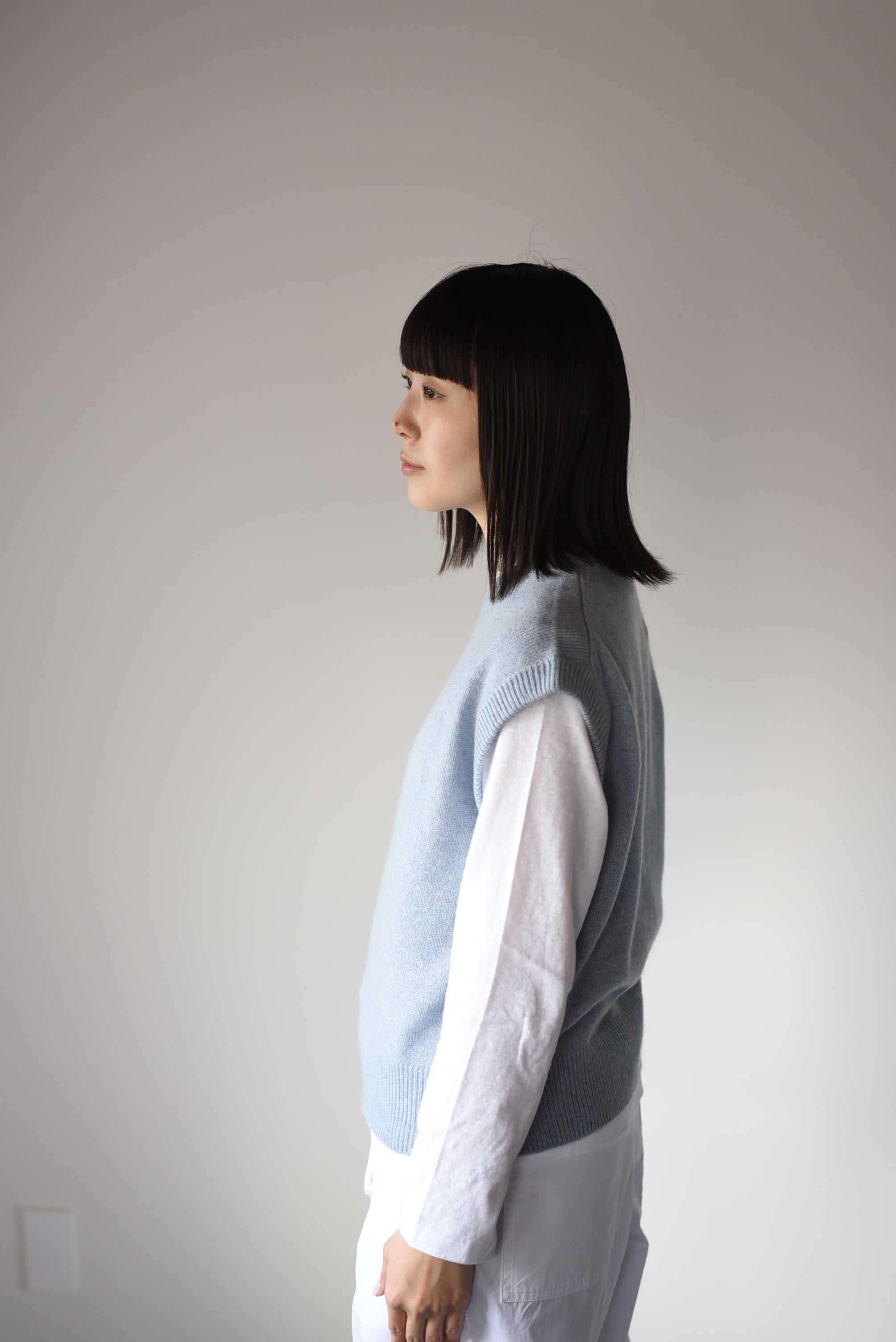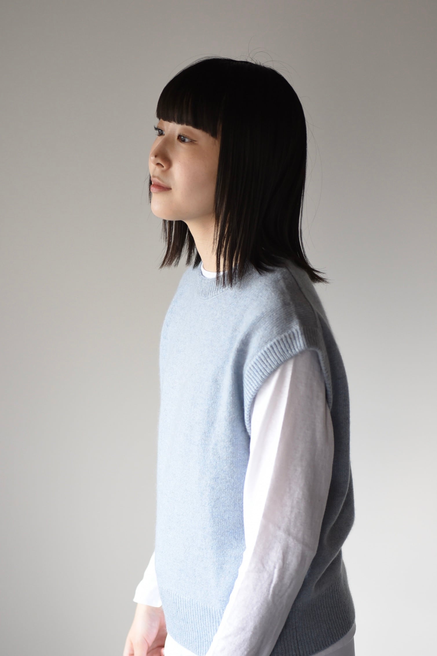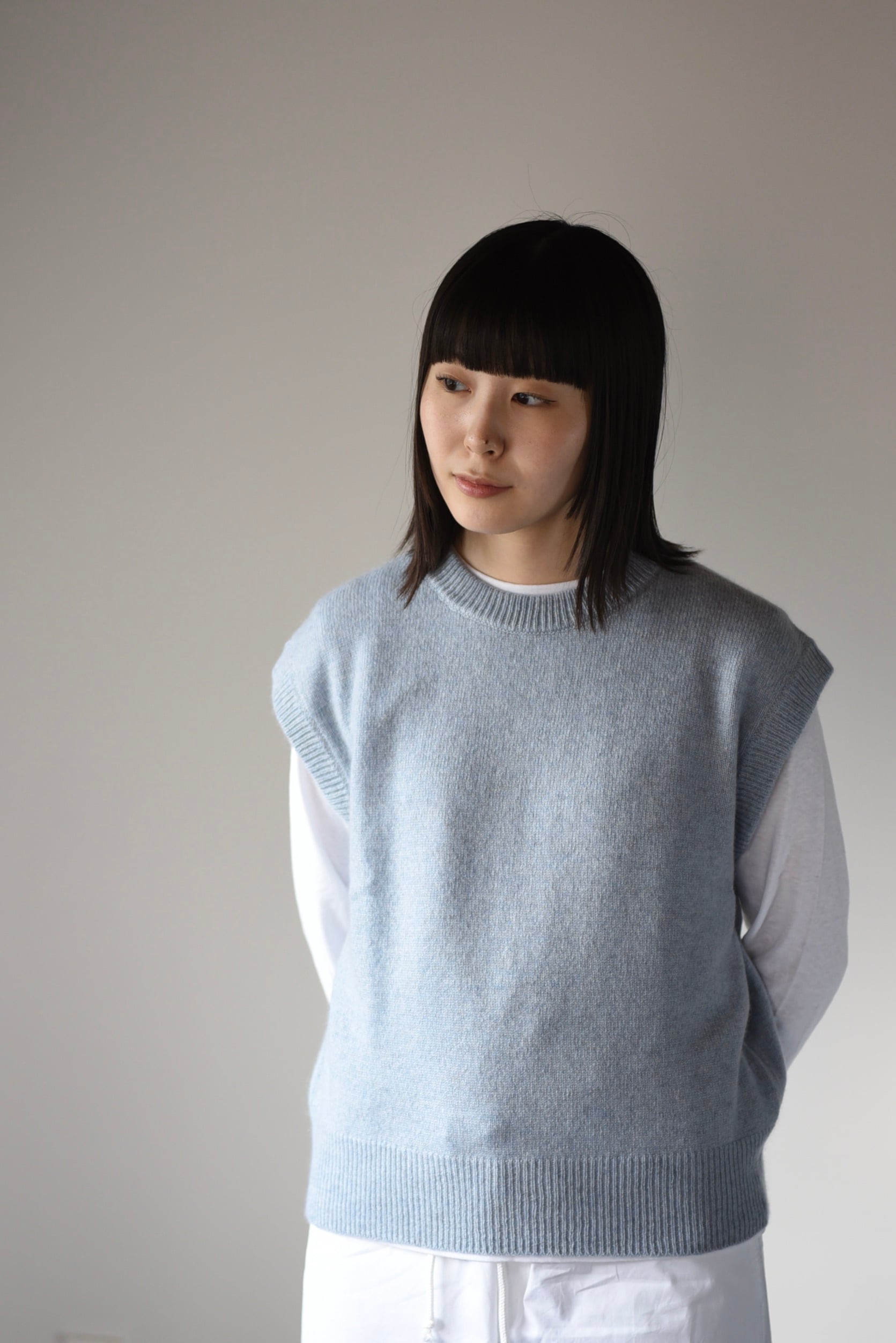 2025年のヤクのベストはこれまでより細い番手の糸で細かく編まれていて、柔らかくちょっと繊細な印象です。そしてドロップショルダー。二の腕を隠すように肩より少し落ちるデザインです。長袖Tシャツと重ねたり、ブラウスと重ねたり、パンツスタイルに合わせてもほんのりと女性らしさがプラスされて、いいバランスでスタイルが決まります。