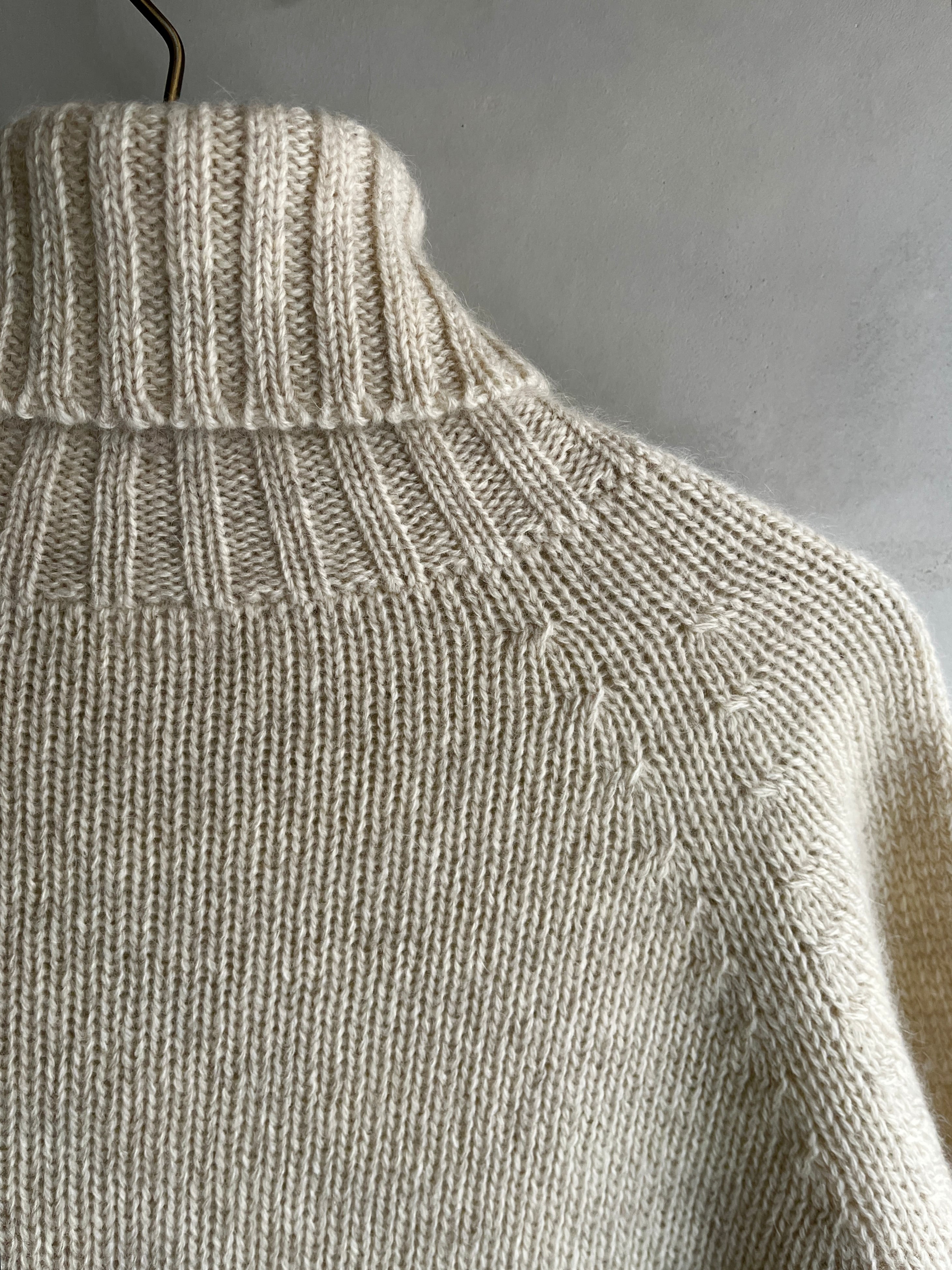 首をすっぽり暖めてくれて本格的な冬にはもちろん、春先はこのセーターに大判のストールを巻いたりと、明るい色ですので長く活躍してくれます。