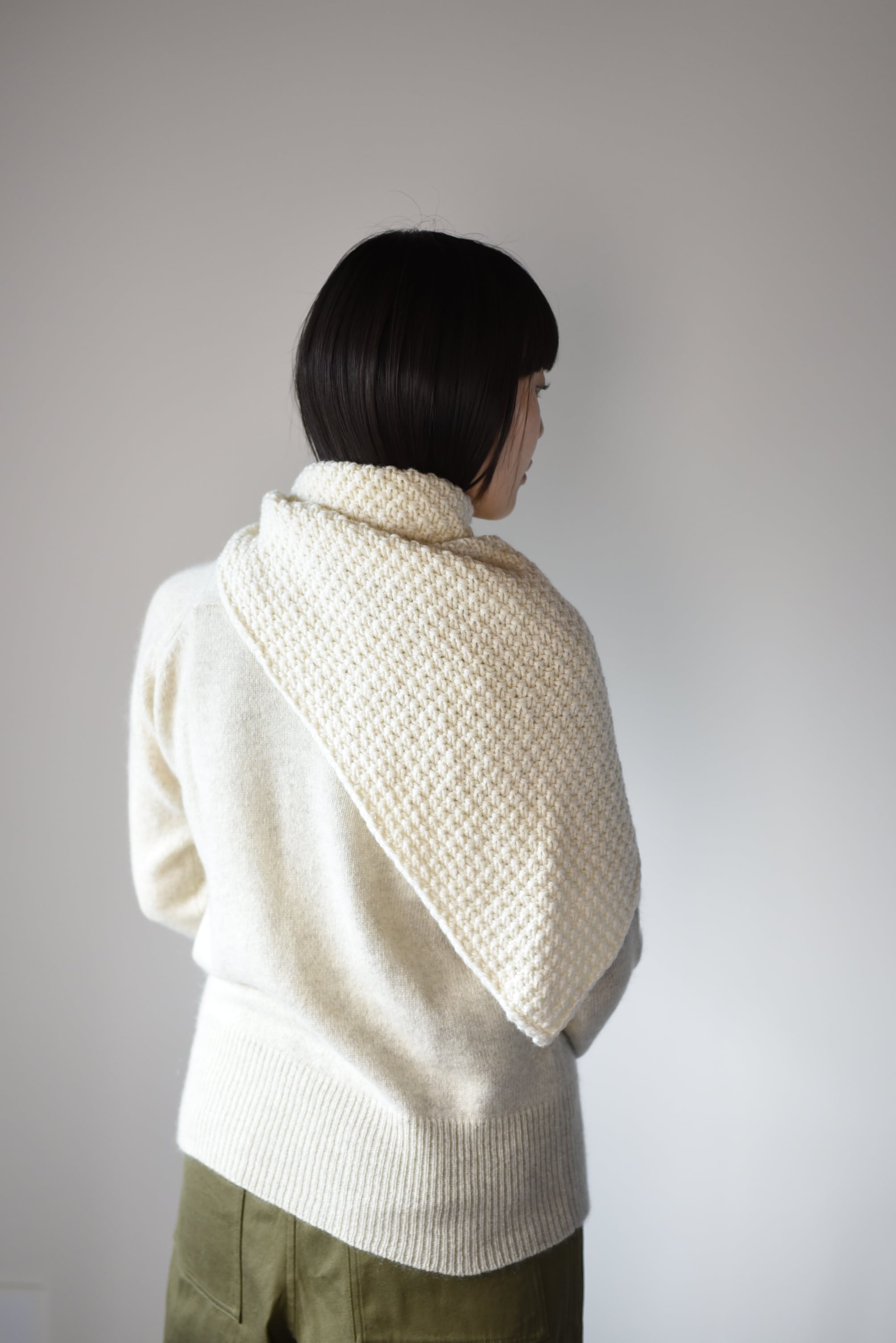 鹿子編みの三角形のストール。ぽこぽことした可愛い糸目が出ています。とても上品な印象があるのは凹凸のある編み目が整っている(伸縮性が比較的低い編み方になります)からでしょうか。
