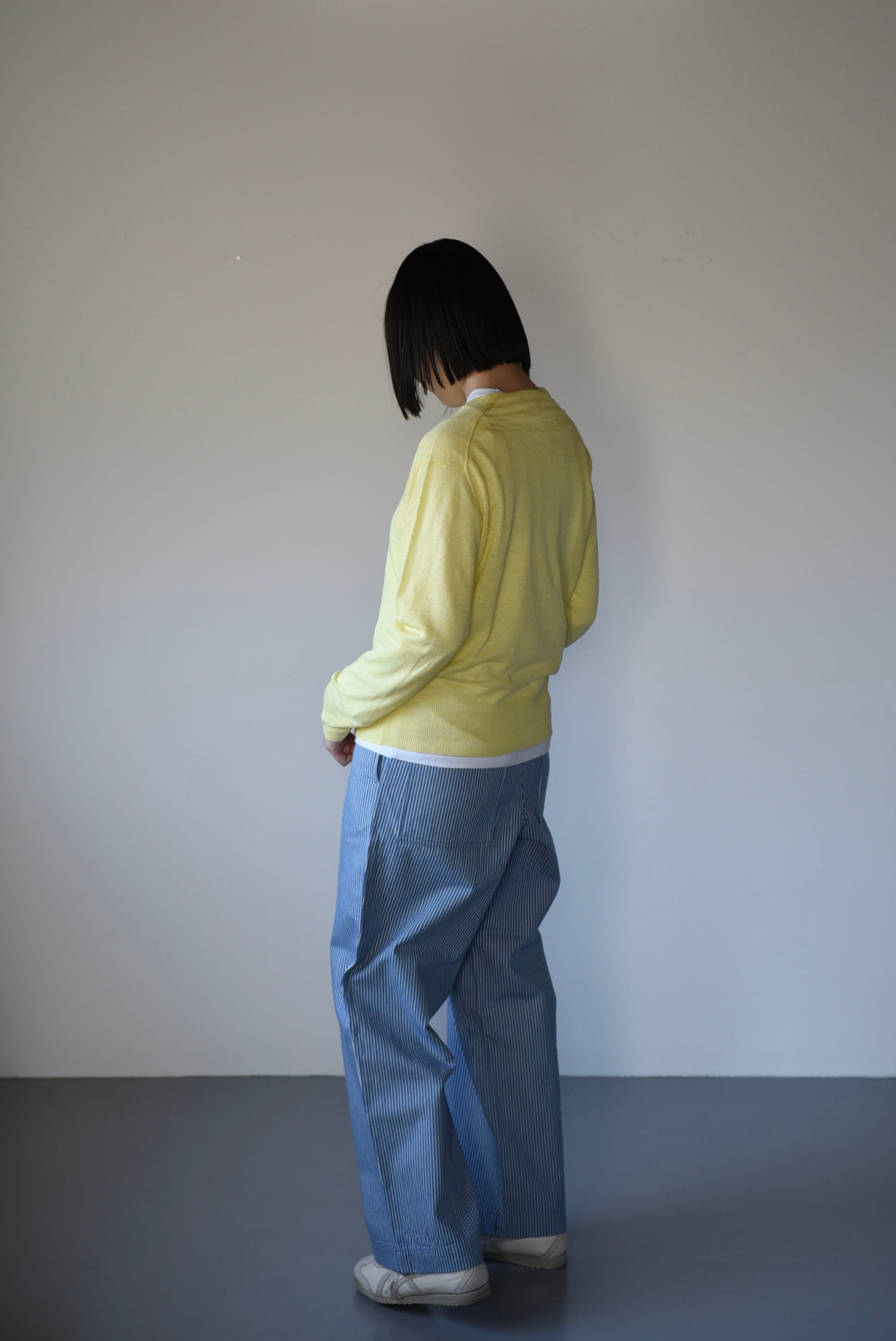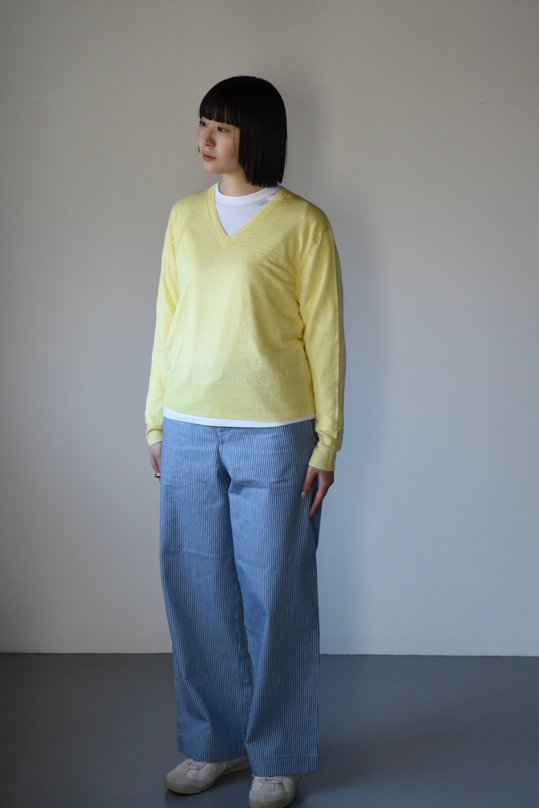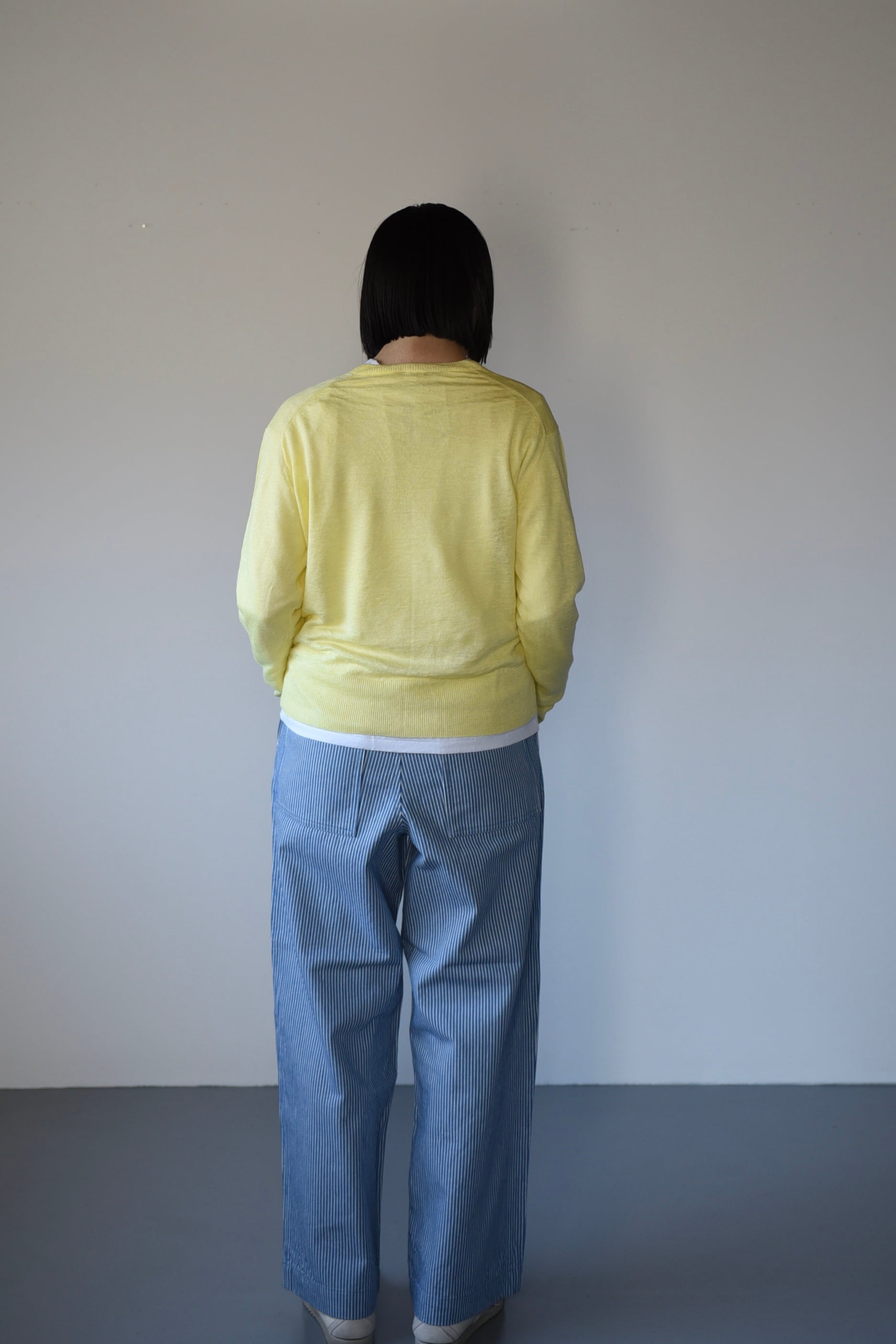 レモンのお色。主張し過ぎない強くないひよこ色。デニムやカーキ、ライトグレー、ライトブルー、ベーシックなブラックや生成りなどにも合わせて楽しめます(着用写真はeleven 2ndのブルーストライプのパンツ)。イエローカラーは一度着てみると意外と合わせやすいのがわかります。ぜひ加えて頂きたいお色です。