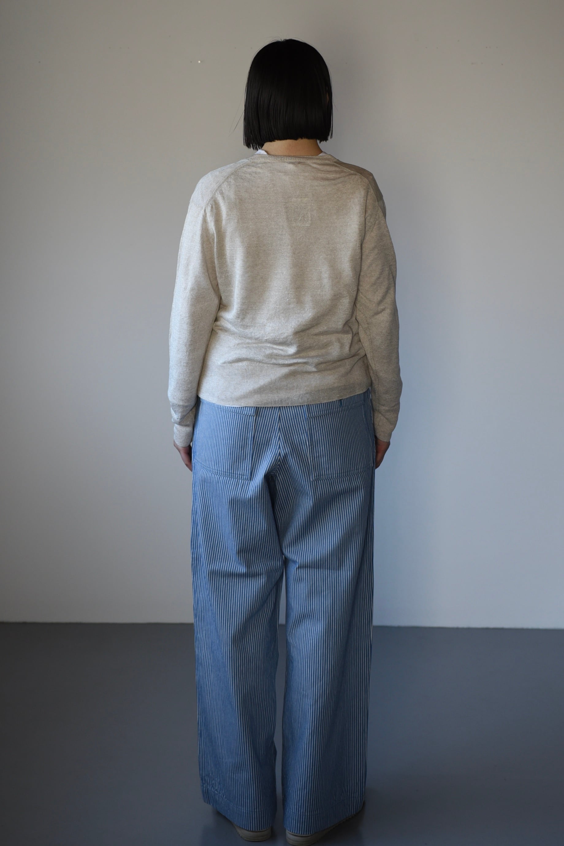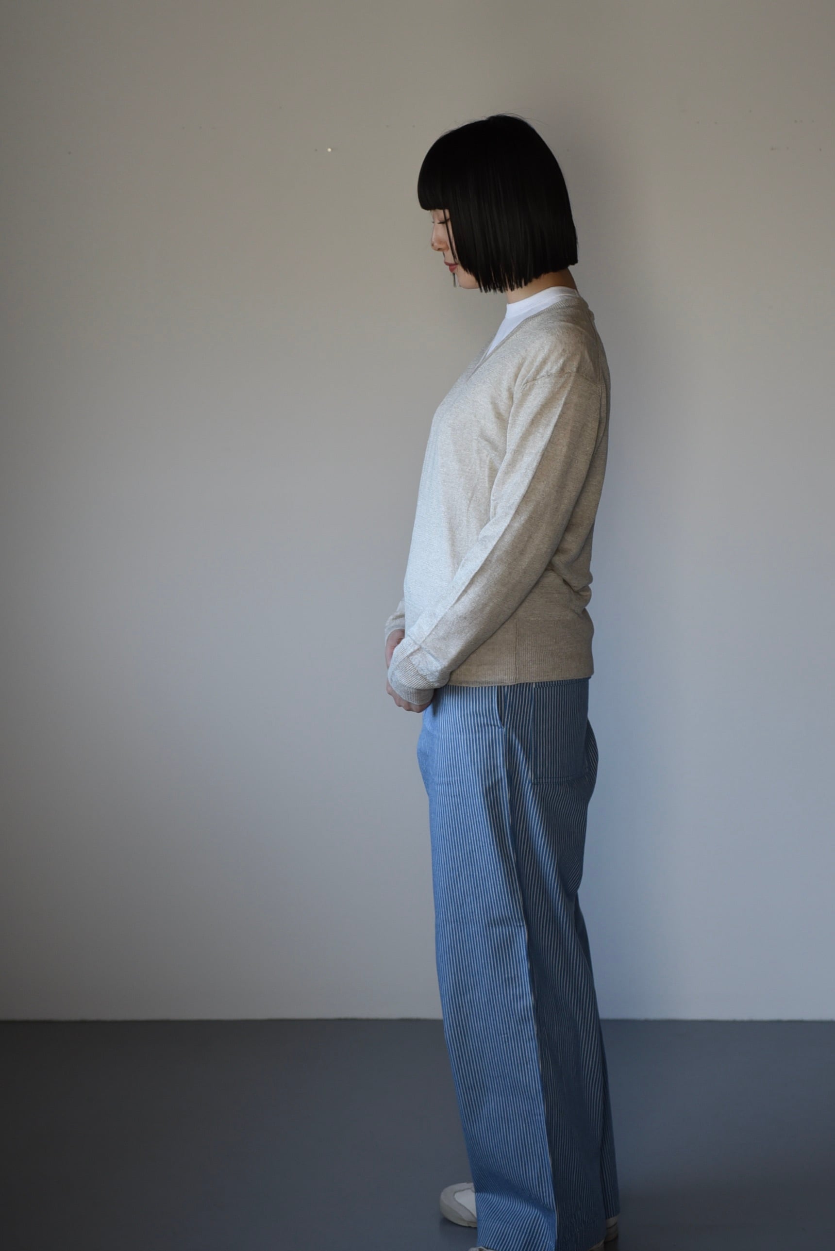 ベーシックなお色。落ち着いた大人カラーです。デニムやブラックのほか、チャコールやグレージュなど、淡い色のグラデーションコーディネートも素敵です。カーゴパンツやワークパンツに合わせて、カジュアルスタイルも楽しめます(着用写真はeleven 2ndのブルーストライプのパンツ)。カジュアルに着崩しても品のよさが出るお色です。