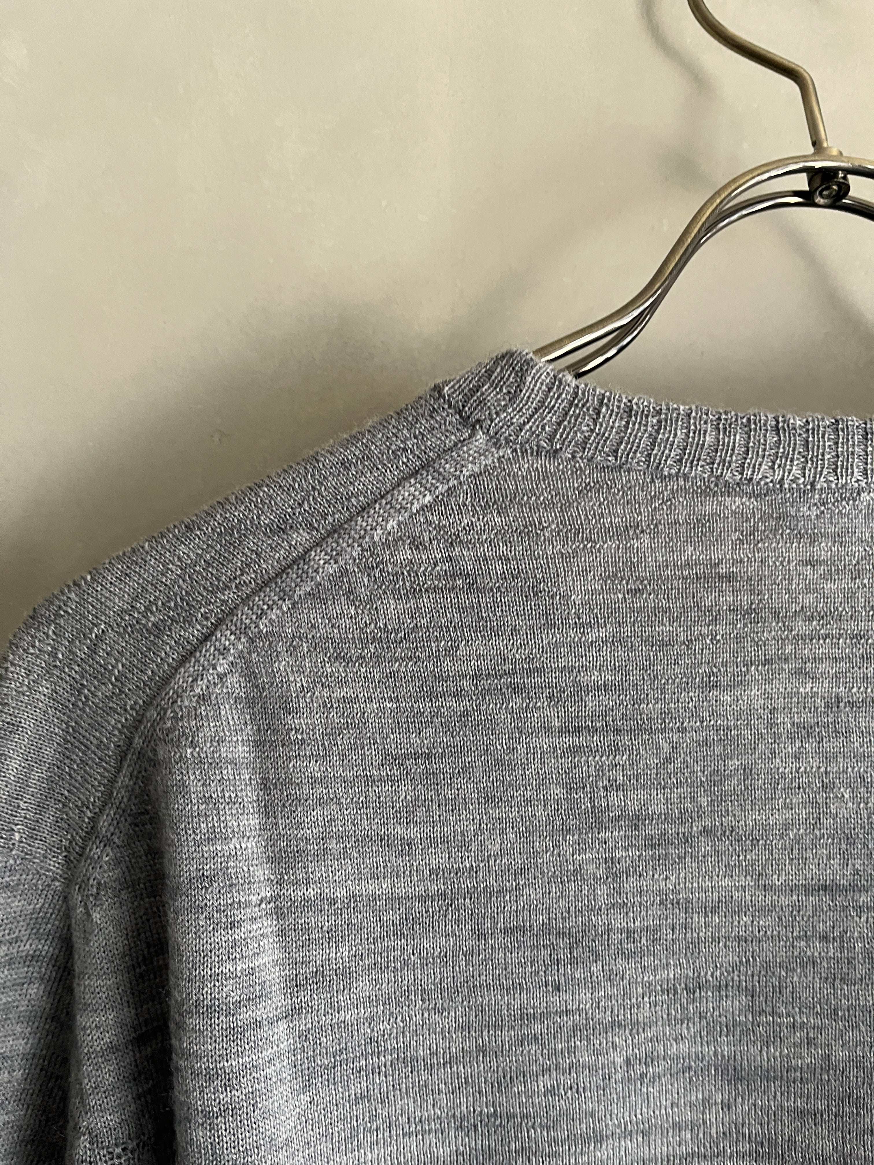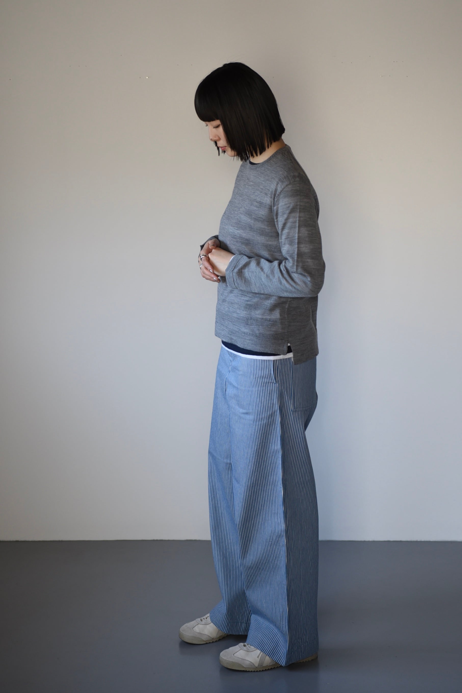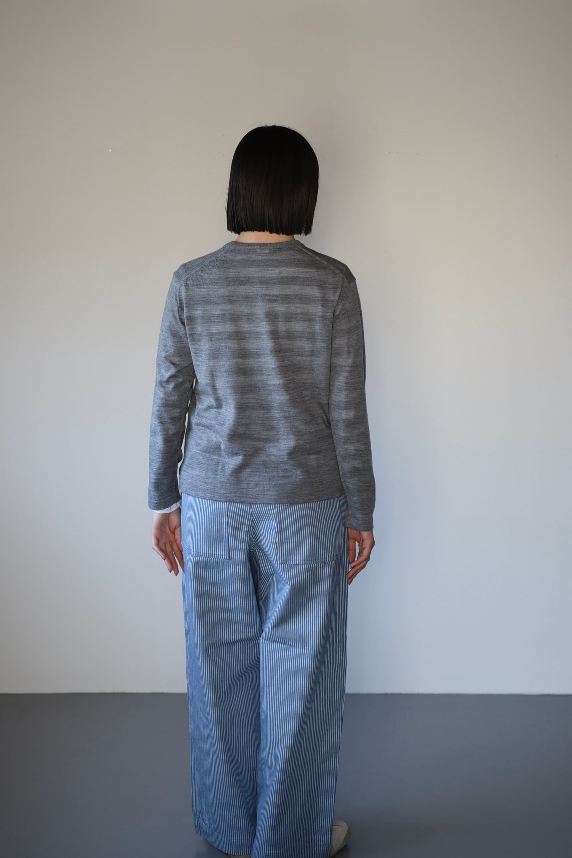 編み目が細かく、薄手で軽やか。少し透けるので下にボーダーTシャツと合わせて、その透け感を楽しんでください。薄手でもウール。温かさは見た目以上です。ウールの冬物感がないので、春の天候に合わせて長く出番がありそうです。着膨れしないので真冬の重ね着にも重宝します