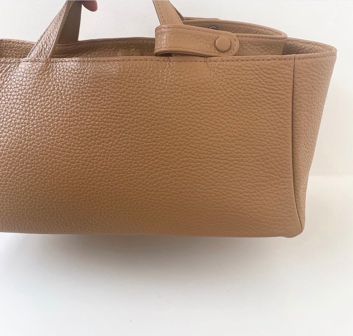 底に芯が入っているので、ものを整理しやすく形もゆるみません。ハンドルに付いている補助ハンドルは腕に通したい時や鍵などをつけて中に入れたりして使えます。