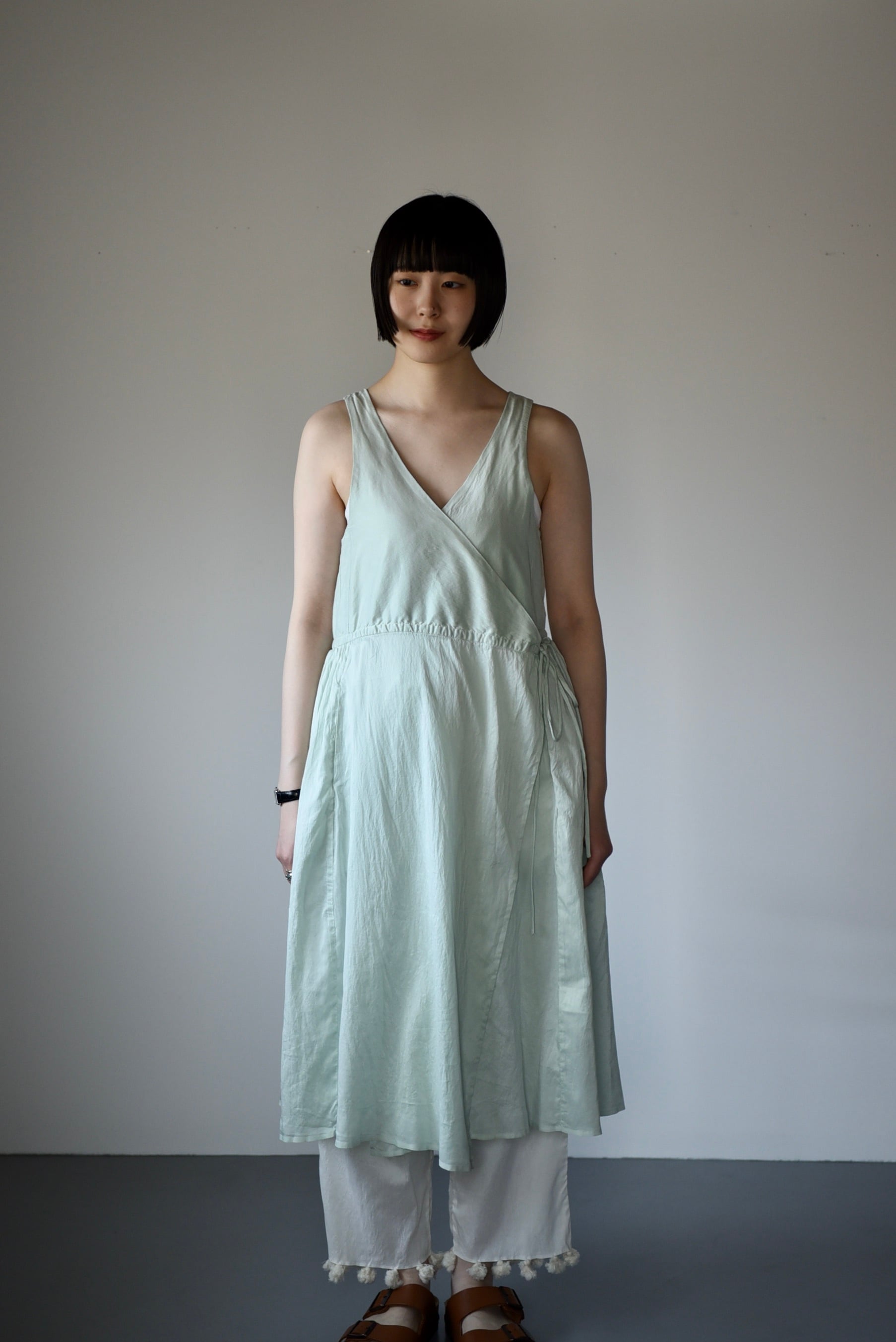 紐で前を合わせるカシュクールのデザイン。下に薄手のワンピースや、キャミソールを合わせて、色や素材の違うものを重ねるのも美しい。