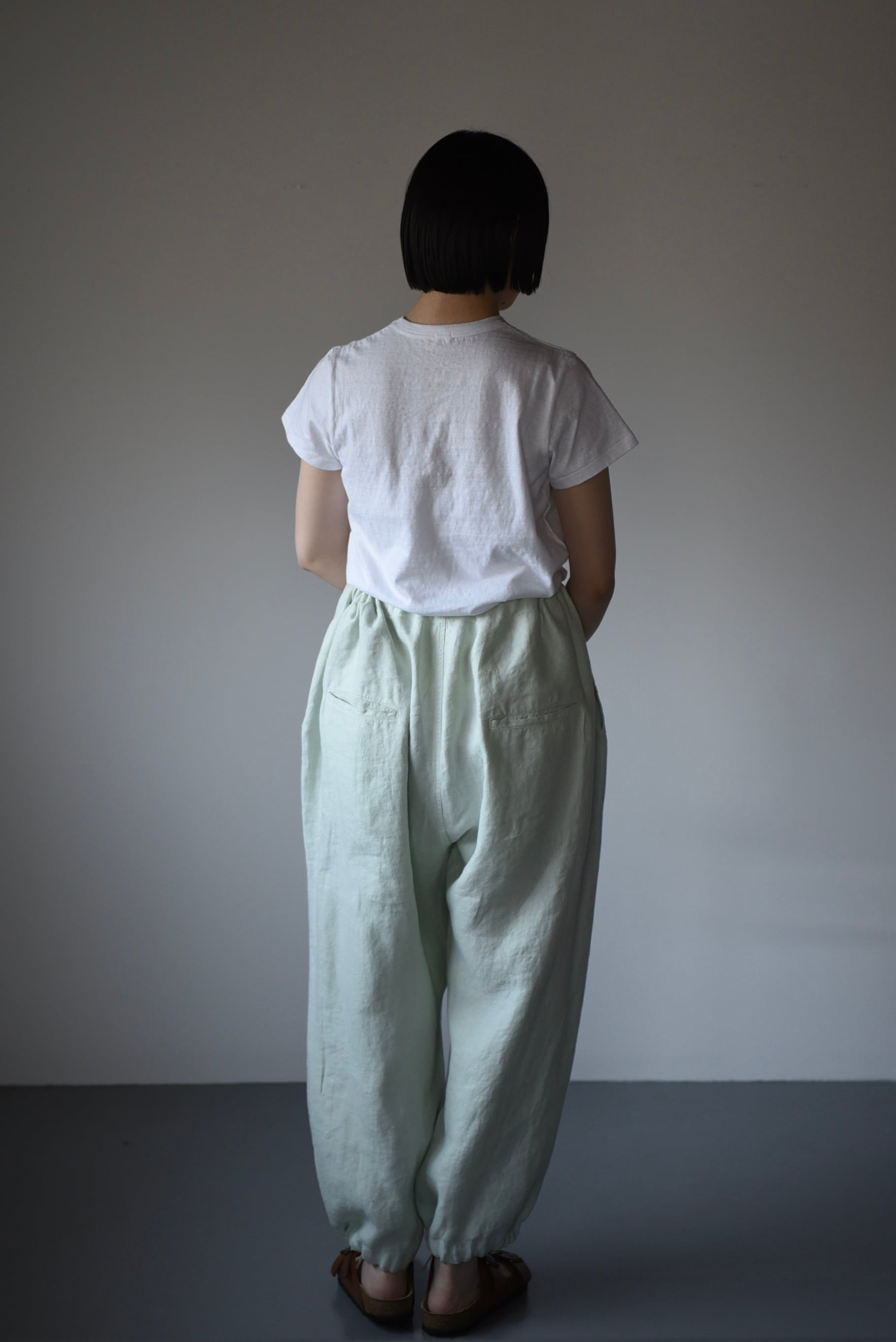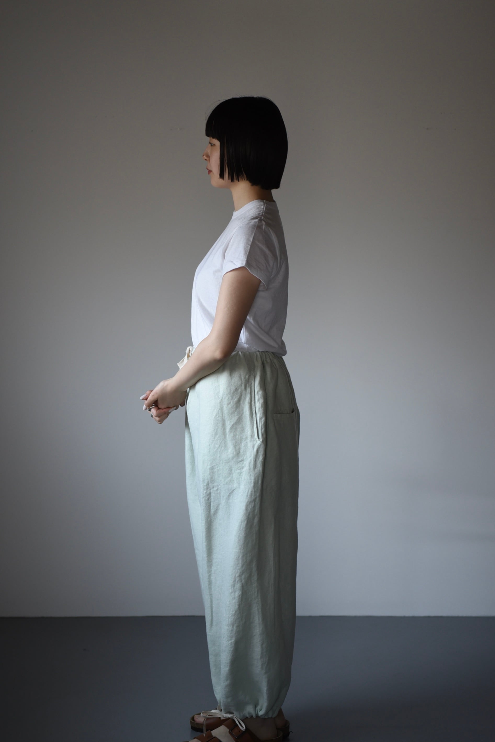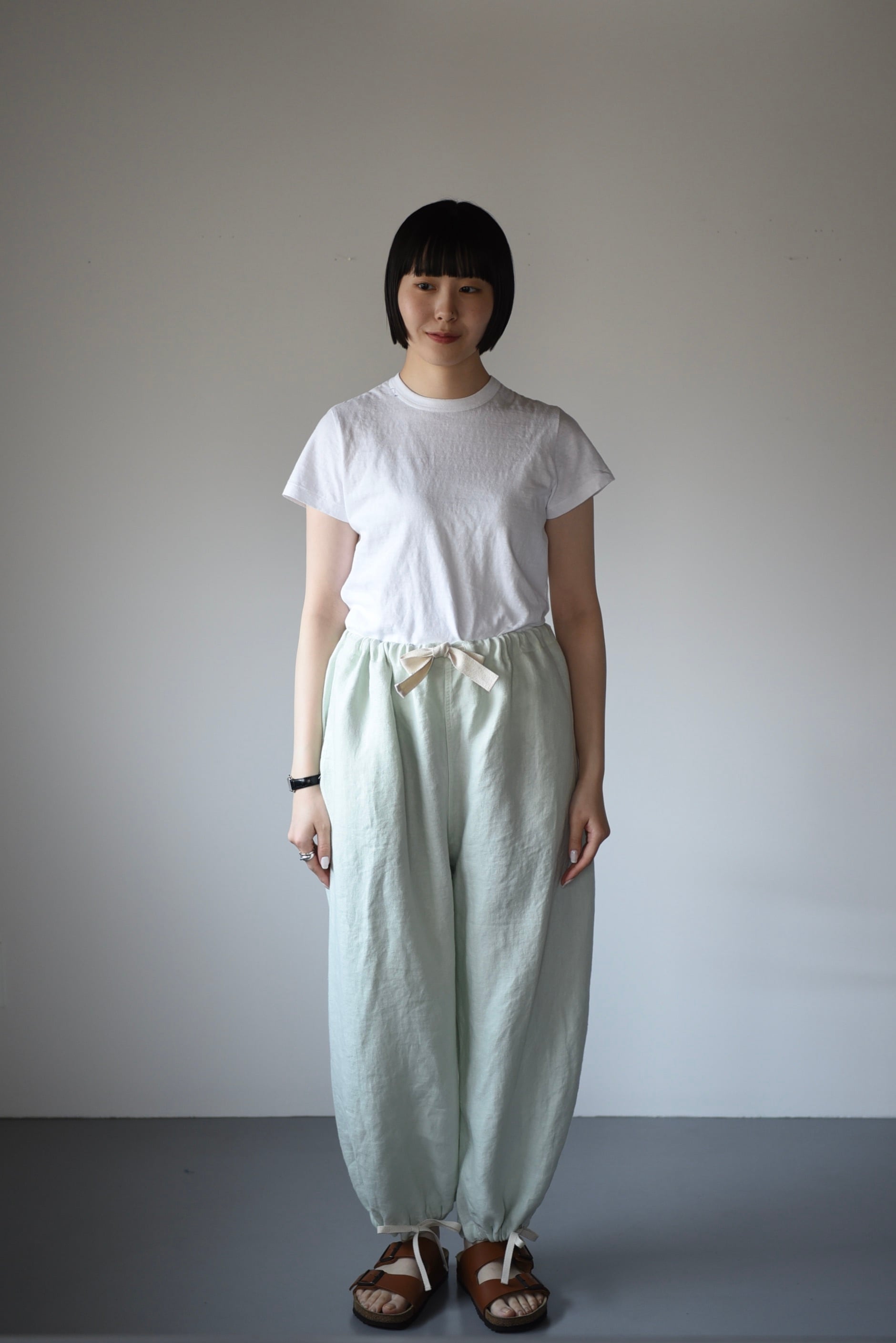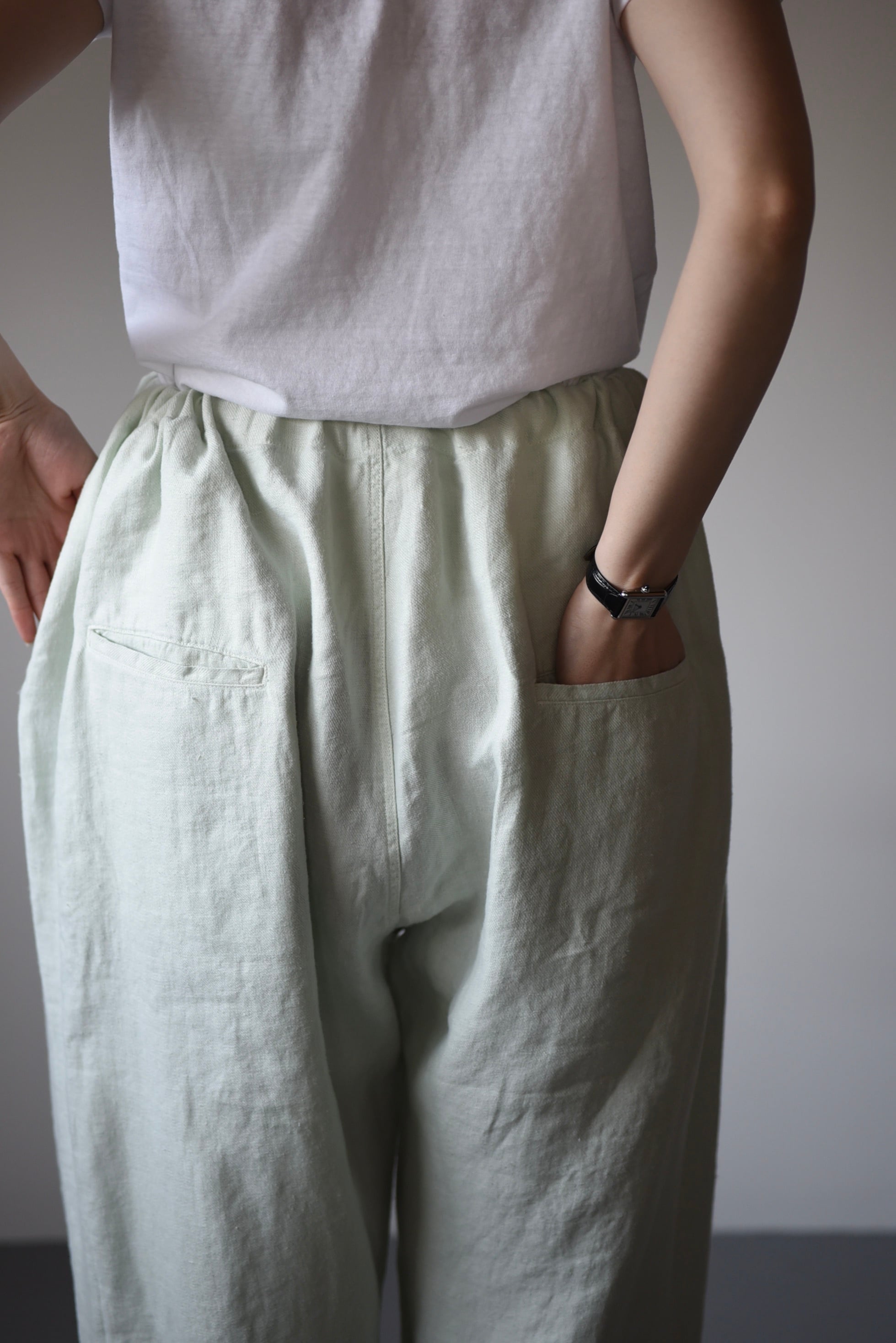 ゆったりとしたヘンプのパンツ。程よく厚みがあるので肌色を透けさせません。