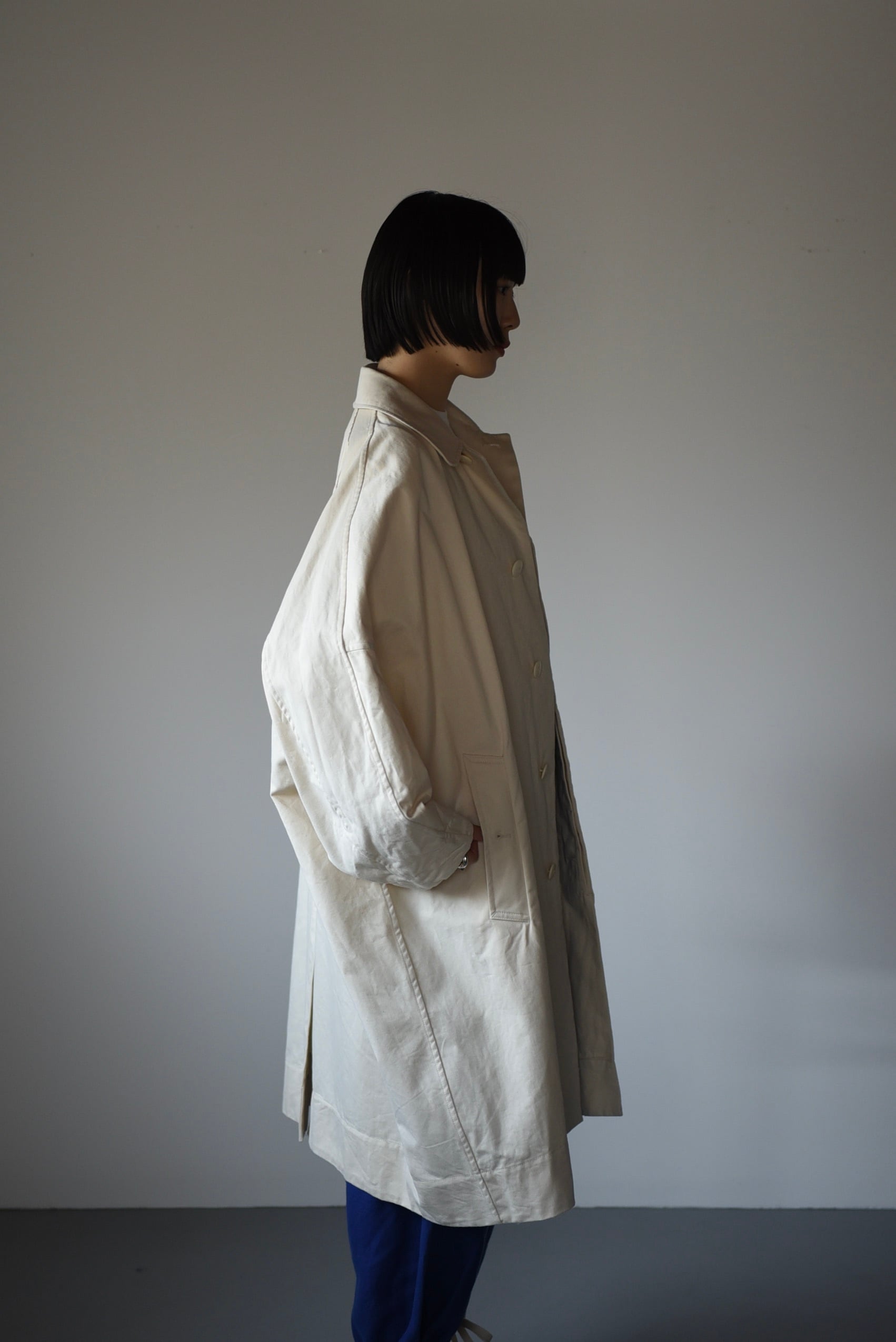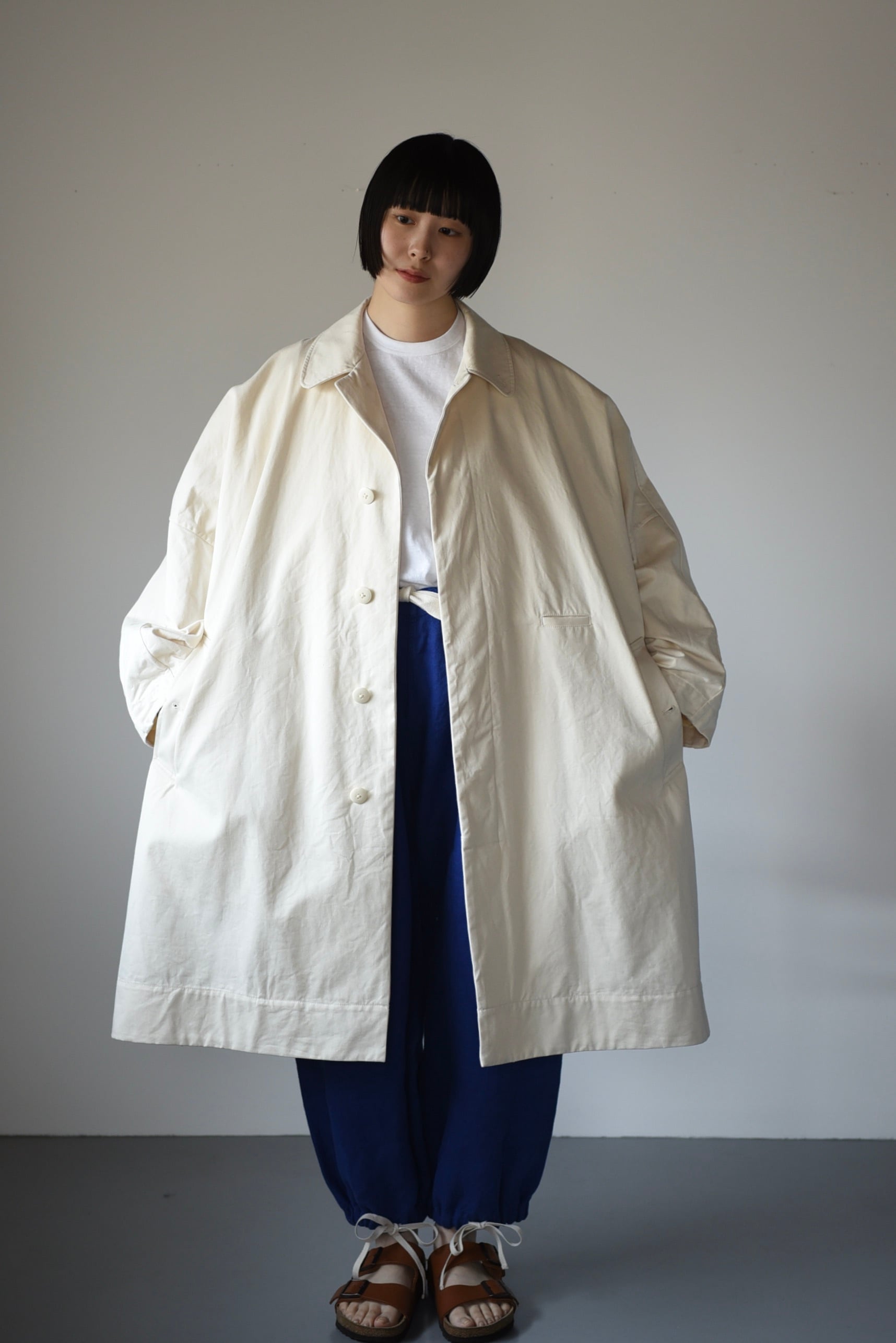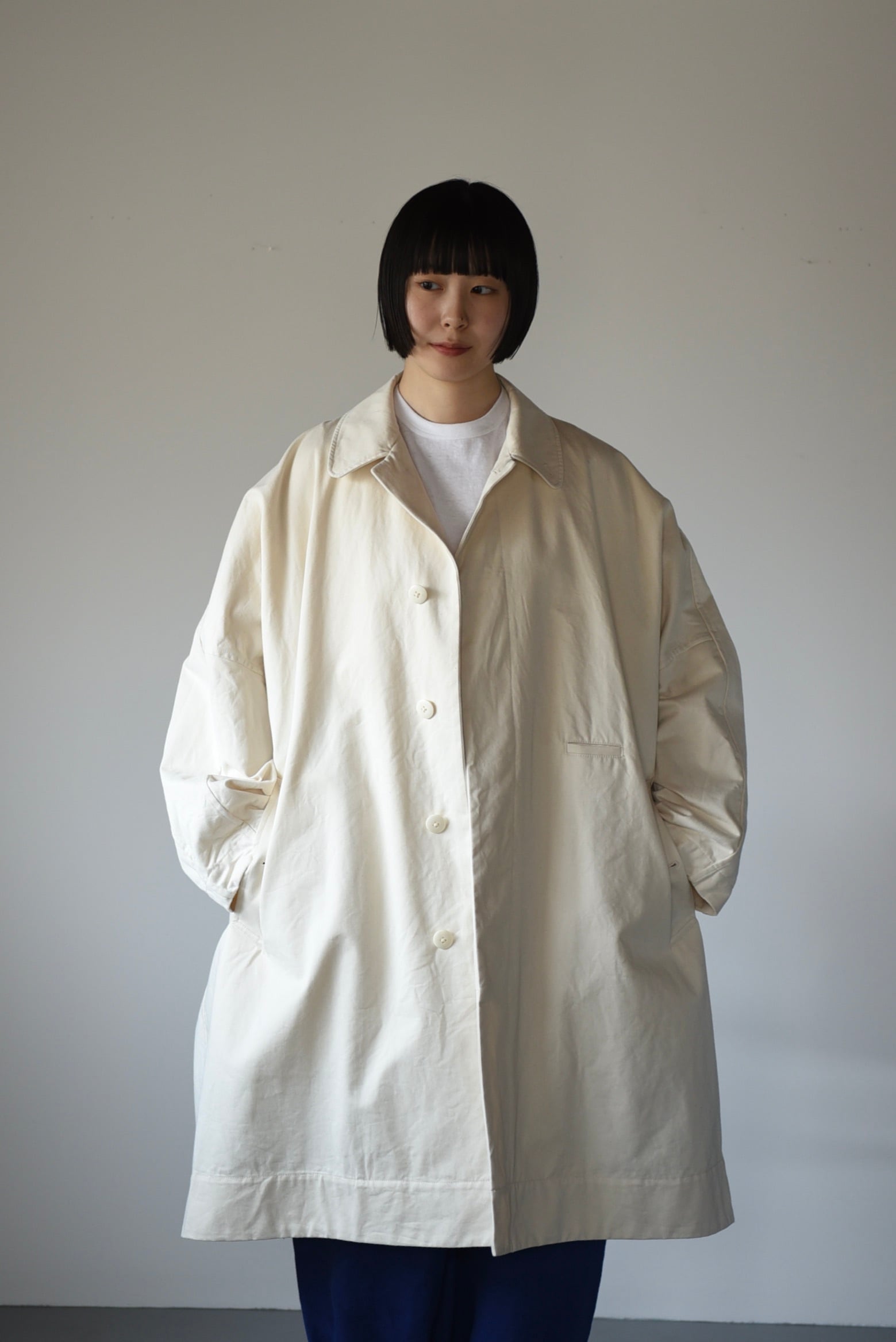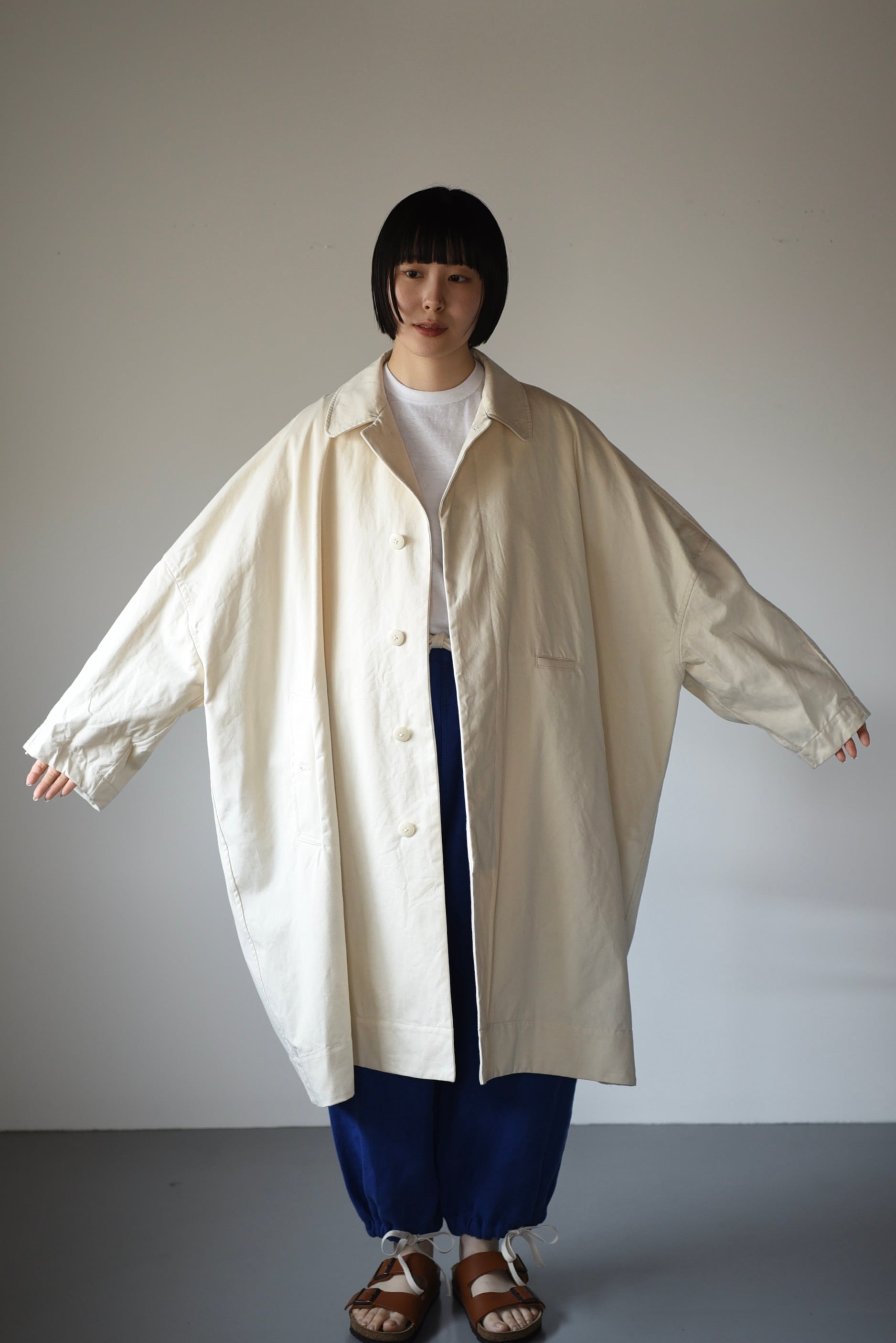 そしてこのコートの生地感が美しい。仕上げの工程で微起毛をしているそうで、肌触りが素晴らしい。オーガニックコットンで織り上げたツイル地。高密度による心地よいハリ感を保ちながら、ささやかで美しい光沢と軽やかな着用感。癖になる肌触りです。