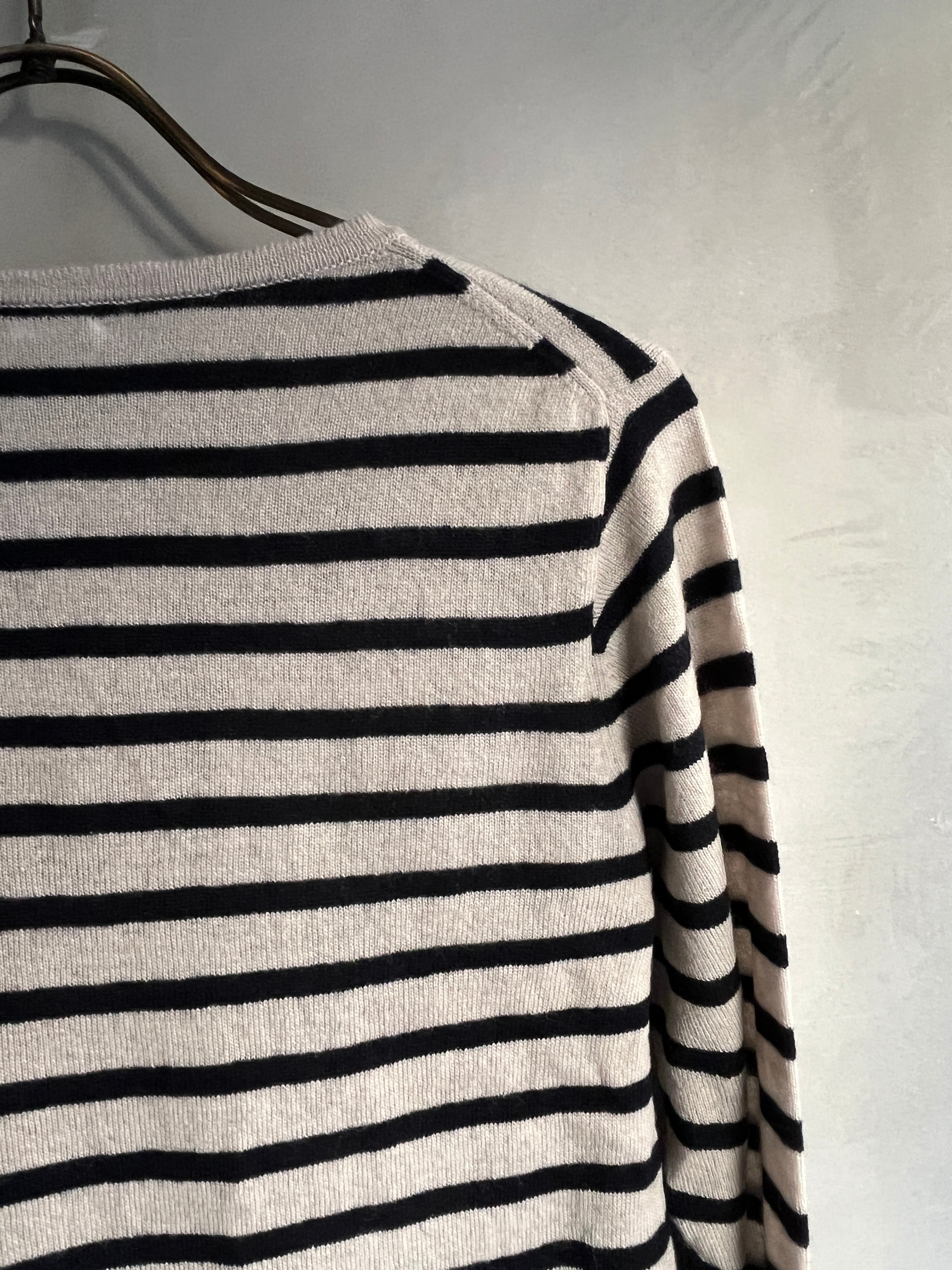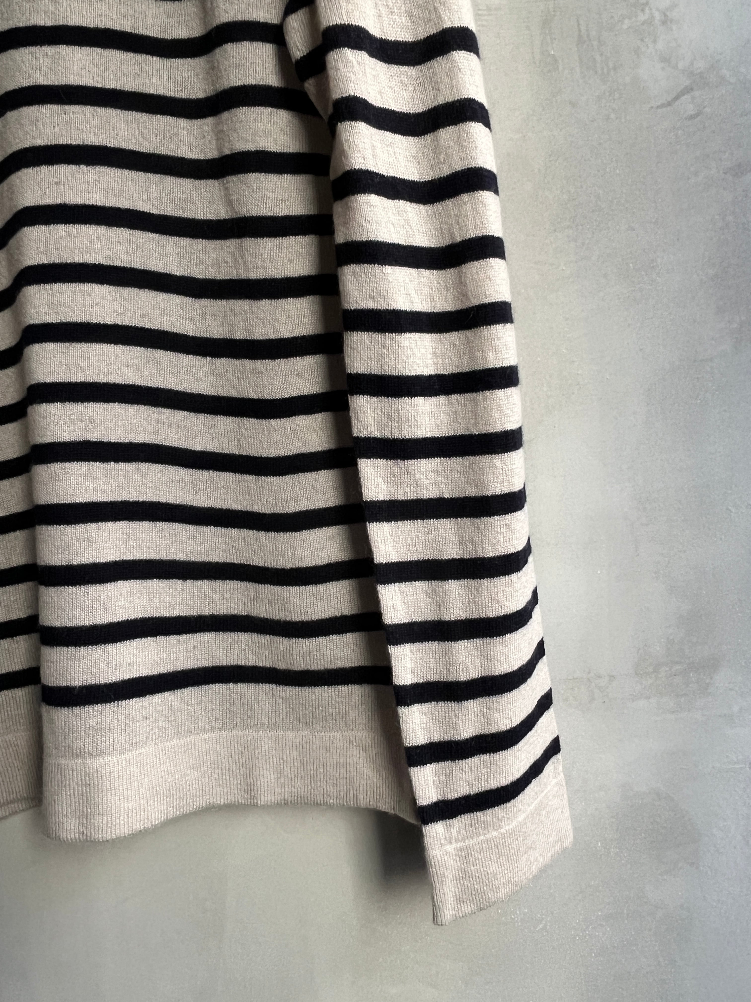 ベージュとネイビーのボーダー柄は、黒白のぱっきりとしたボーダーと違い、落ち着いた印象。「ボーダー柄は似合わない」と思い込んでいる方にもぜひお手に取って頂きセーターです。